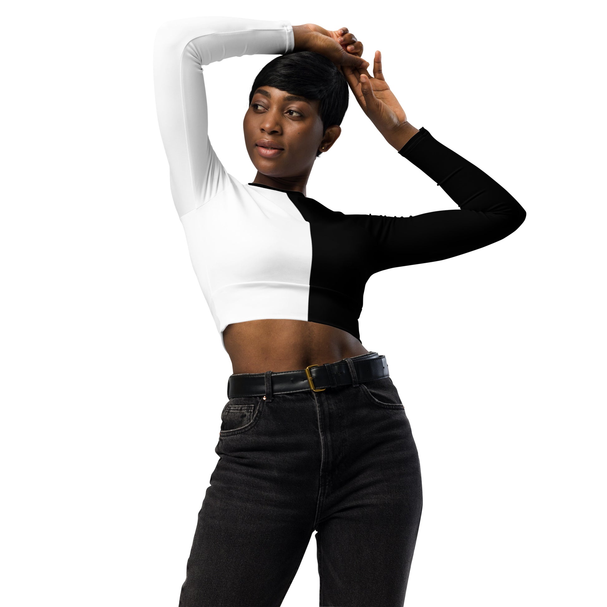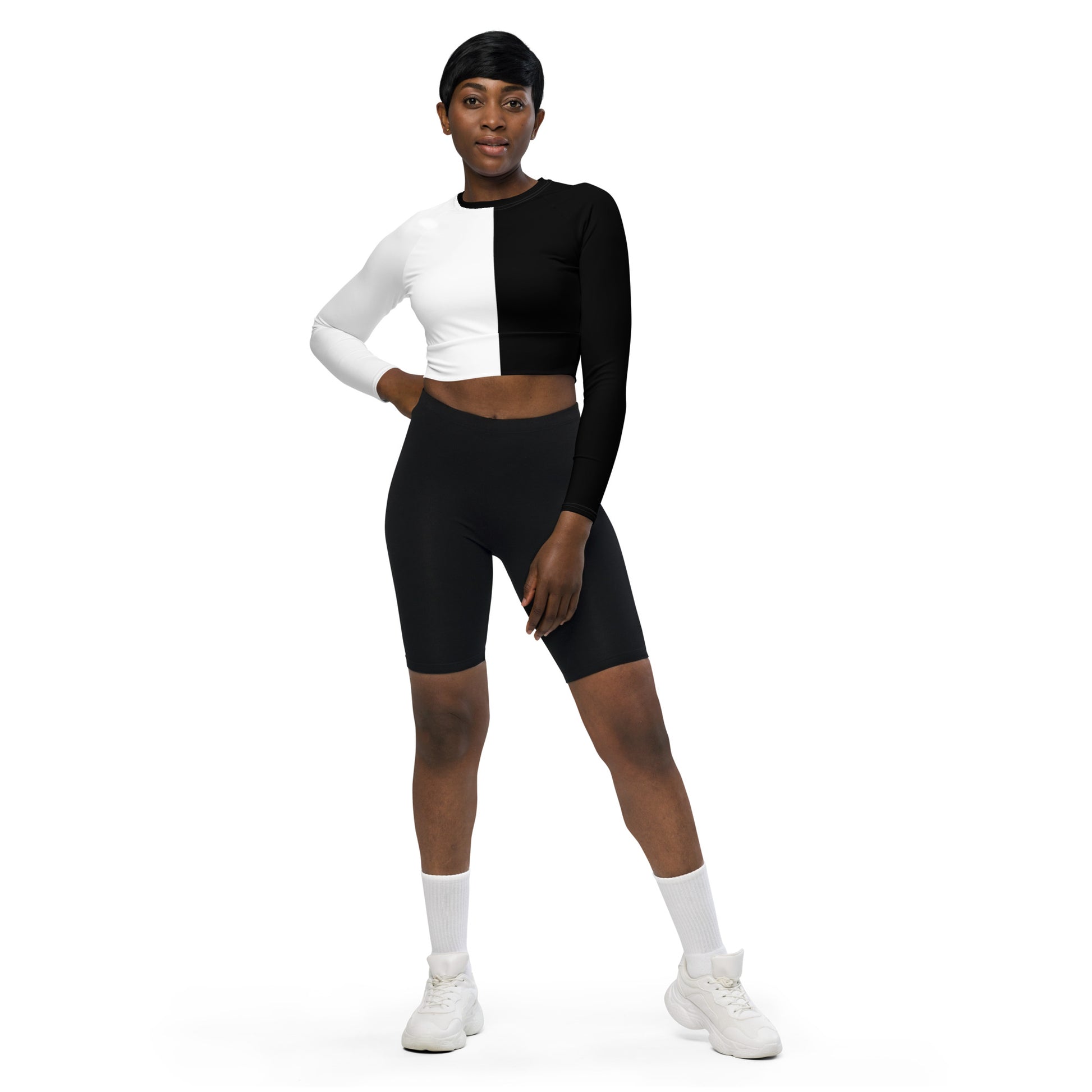 This long-sleeve crop top is made of recycled polyester and elastane, making it an eco-friendly choice for swimming, sports, or athleisure outfits. The crop top has a tear-away care label and a wide, double-layered waistline band for a comfortable fit.
