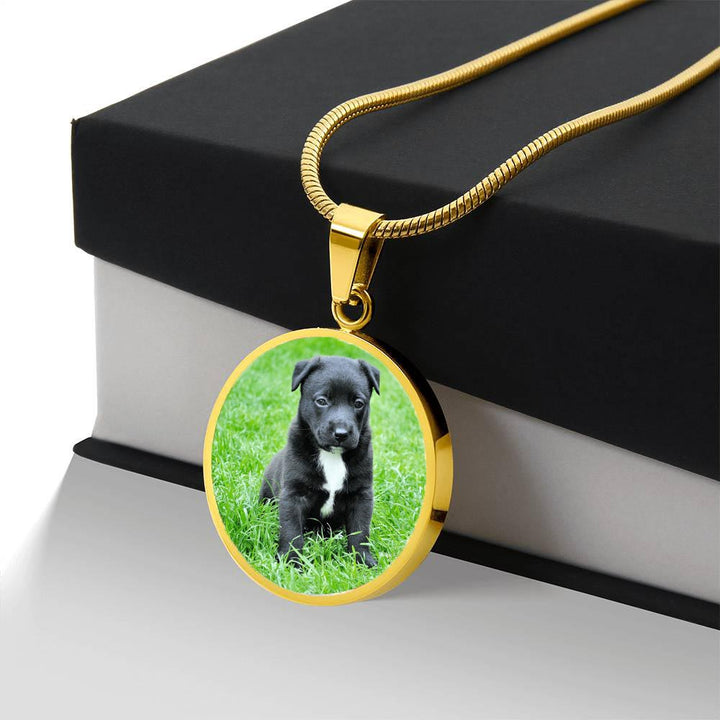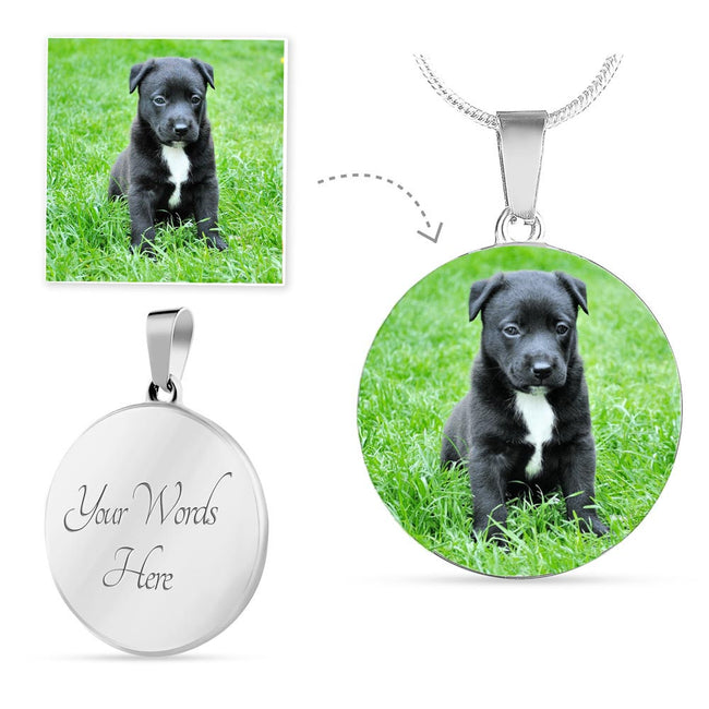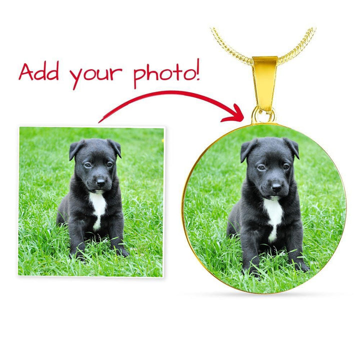 • Celebrate the unconditional love of your furry friend with a necklace that keeps their memory close to your heart. This custom pet photo pendant is crafted from premium surgical steel with the option of an elegant 18k gold finish, designed to shine for years to come.