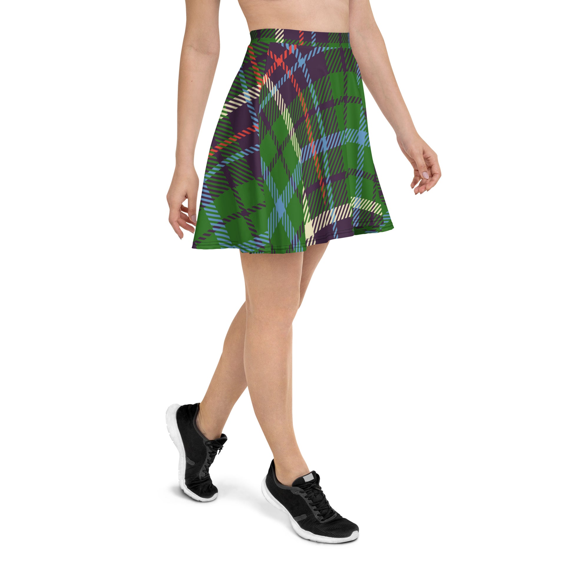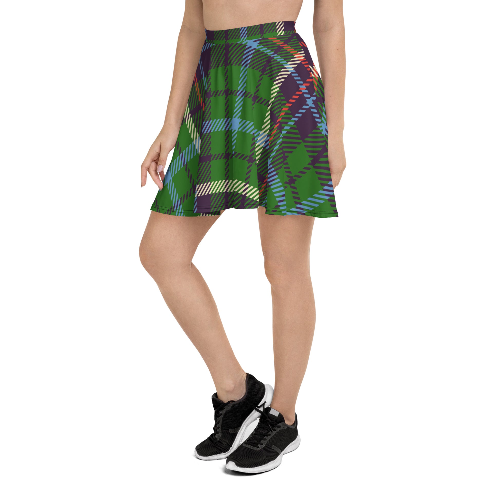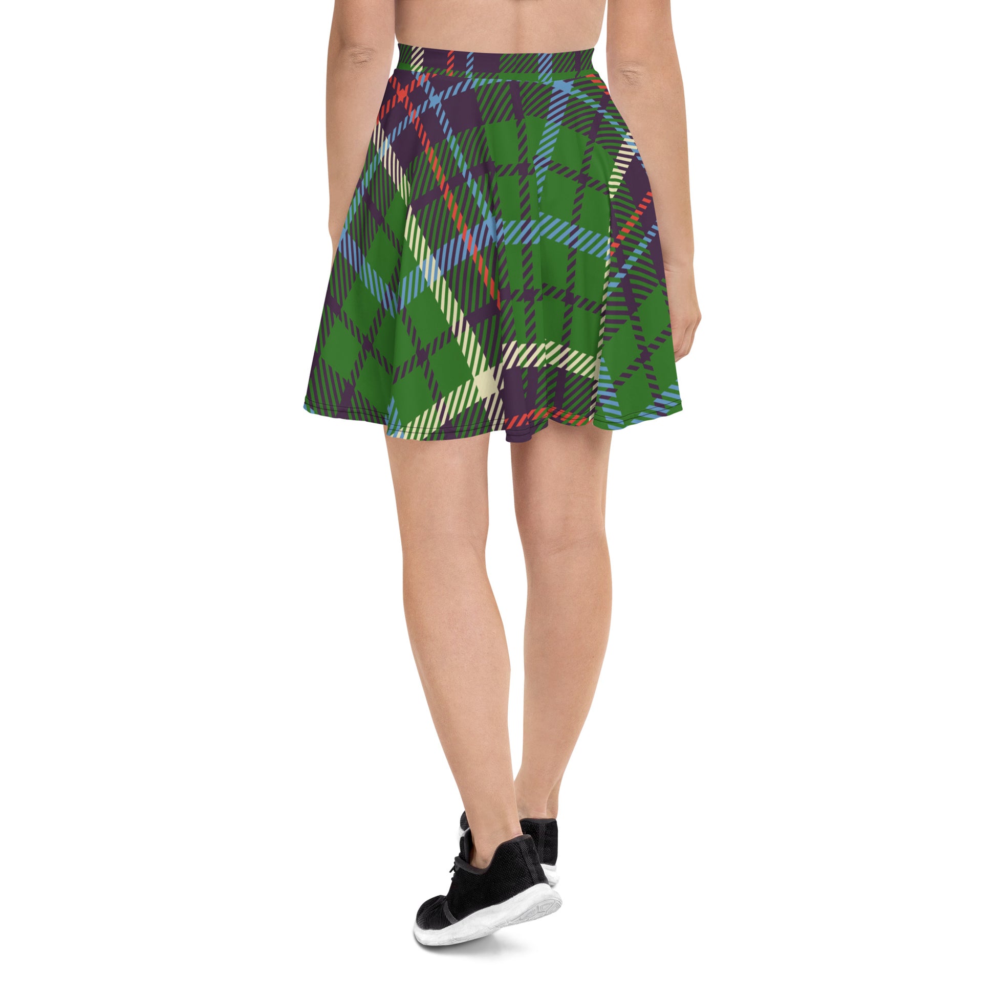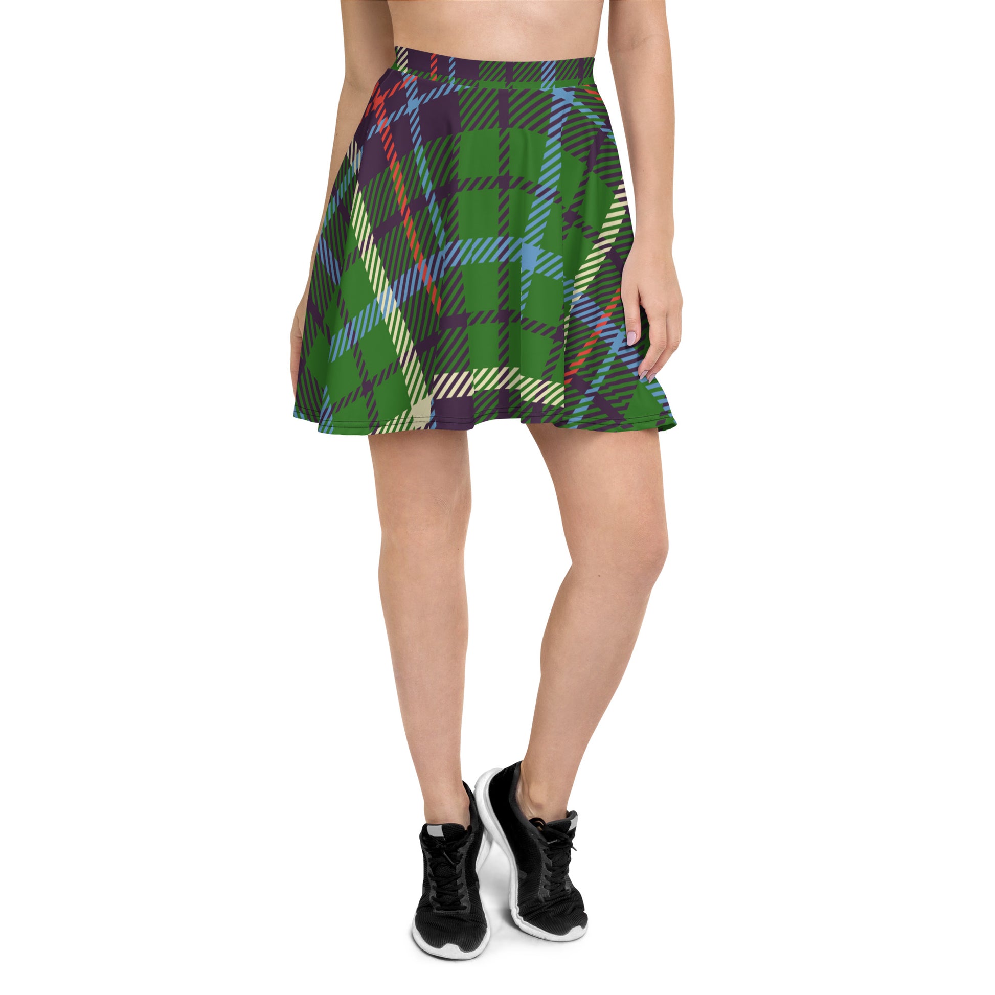 Our green multi-color plaid skater skirt is very fashionable and comfortable. It has a flattering silhouette that looks great on any body type, and thanks to the elastic waistband, you'll feel extra comfy.