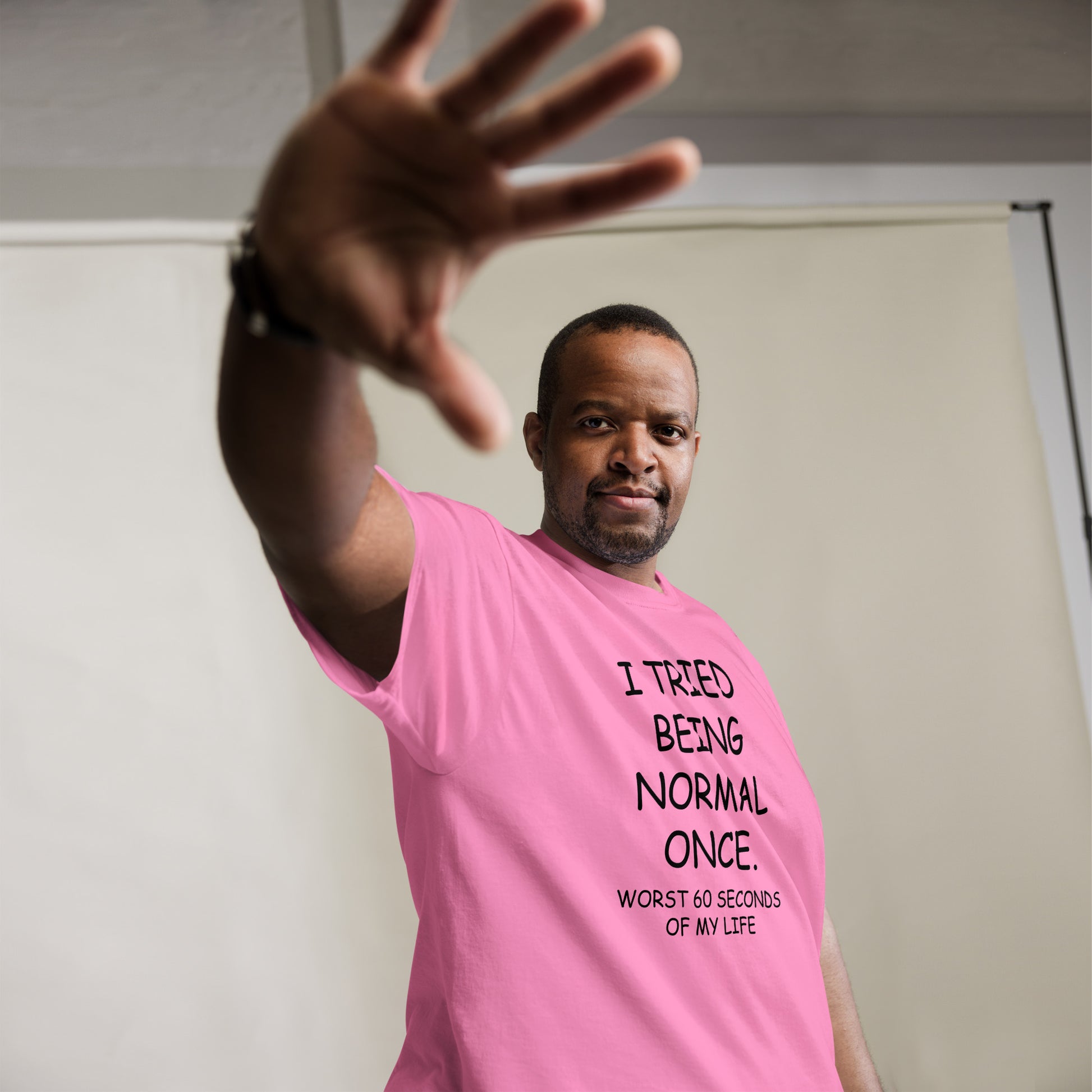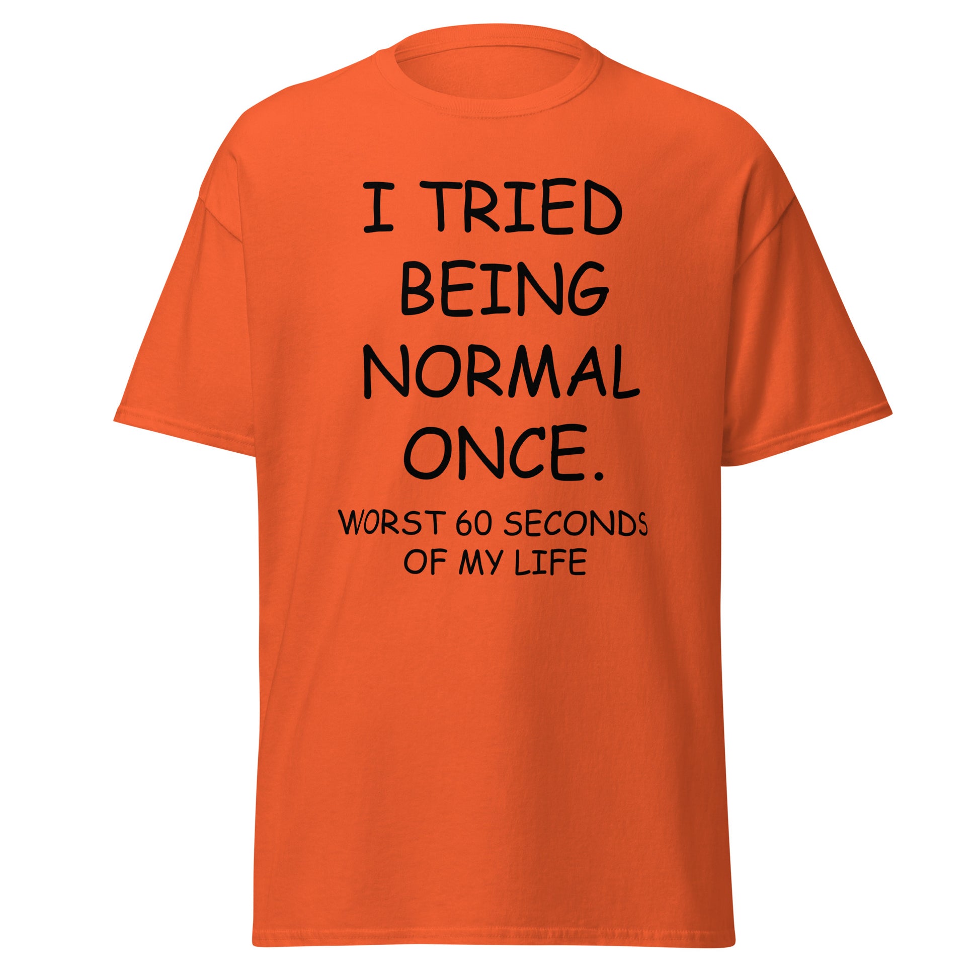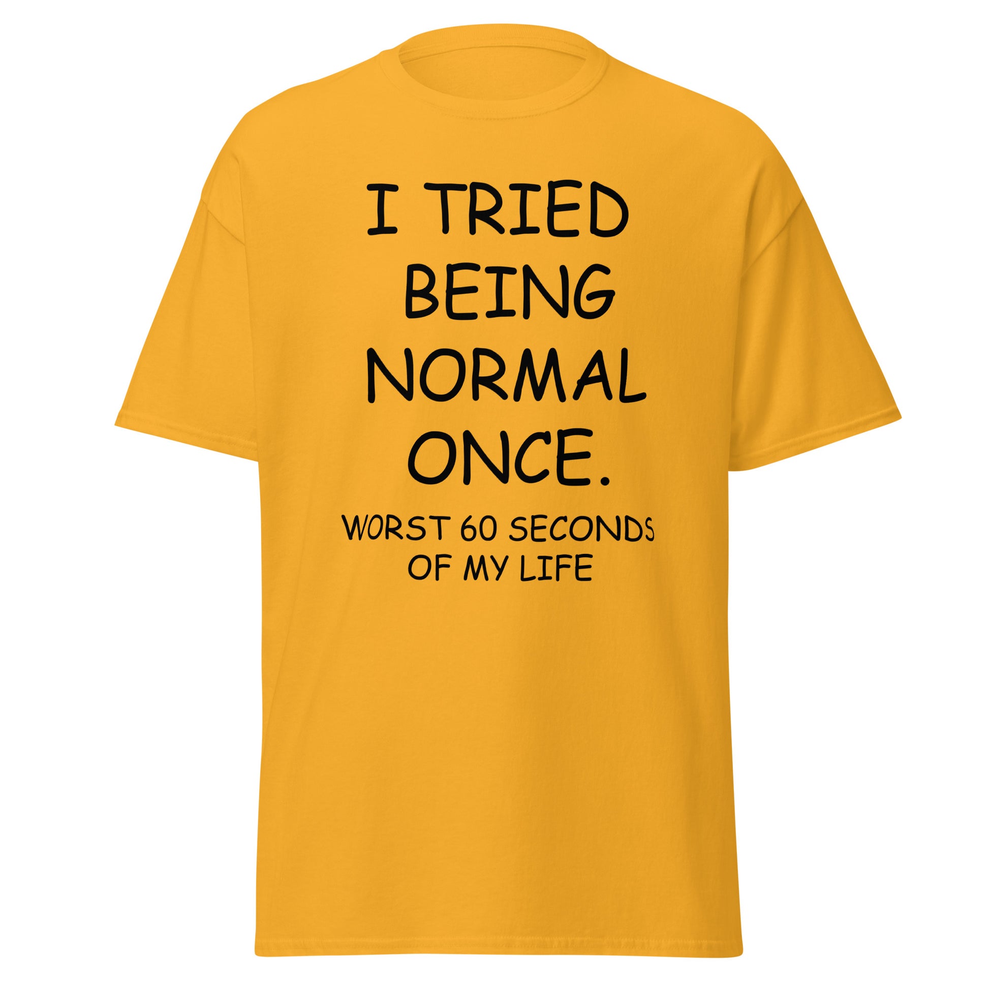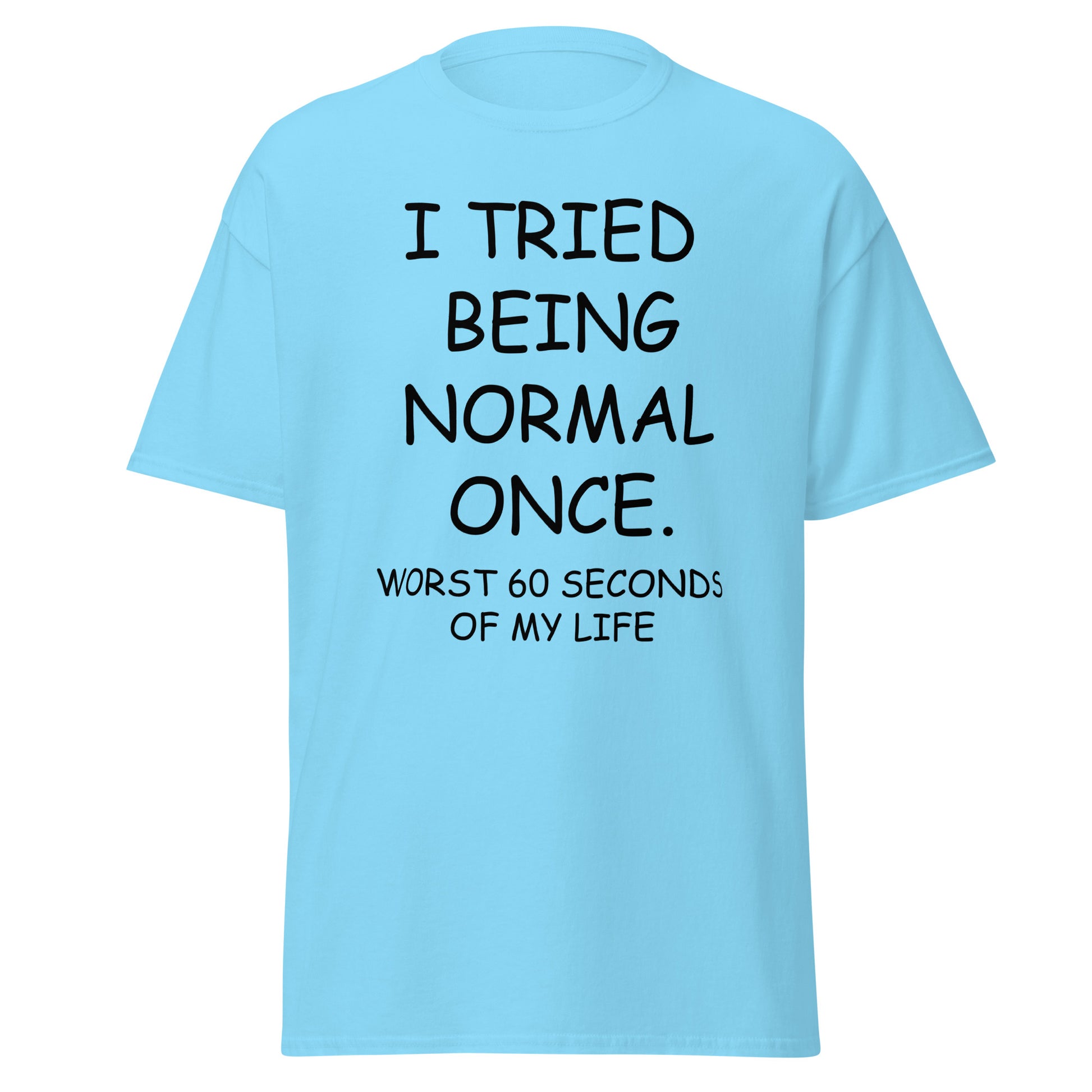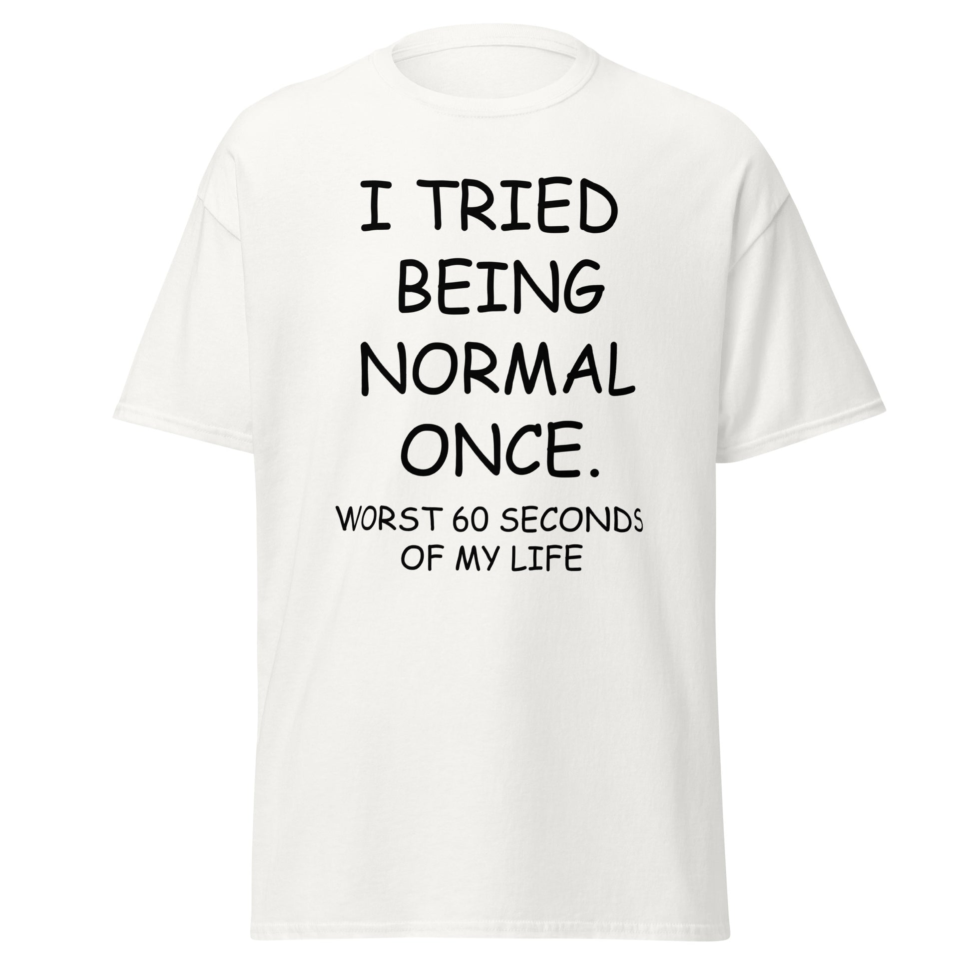 Embrace your individuality with our "I Tried Being Normal Once. Worst 60 Seconds of My Life" unisex t-shirt! Crafted from 100% cotton, this classic tee offers a structured look that sits nicely and maintains sharp lines around the edges. Perfect for anyone. It's an ideal choice for anyone who loves to stand out from the crowd.