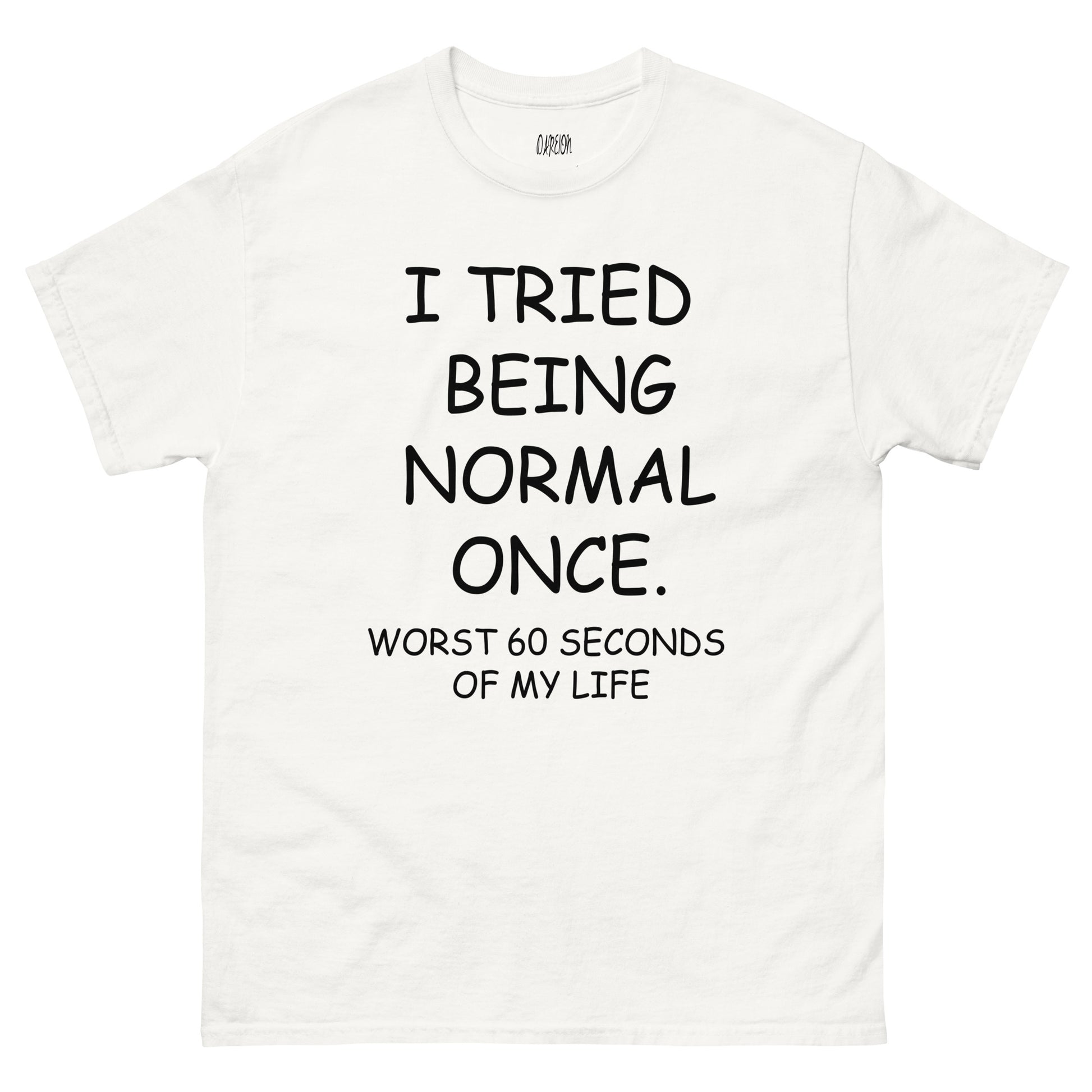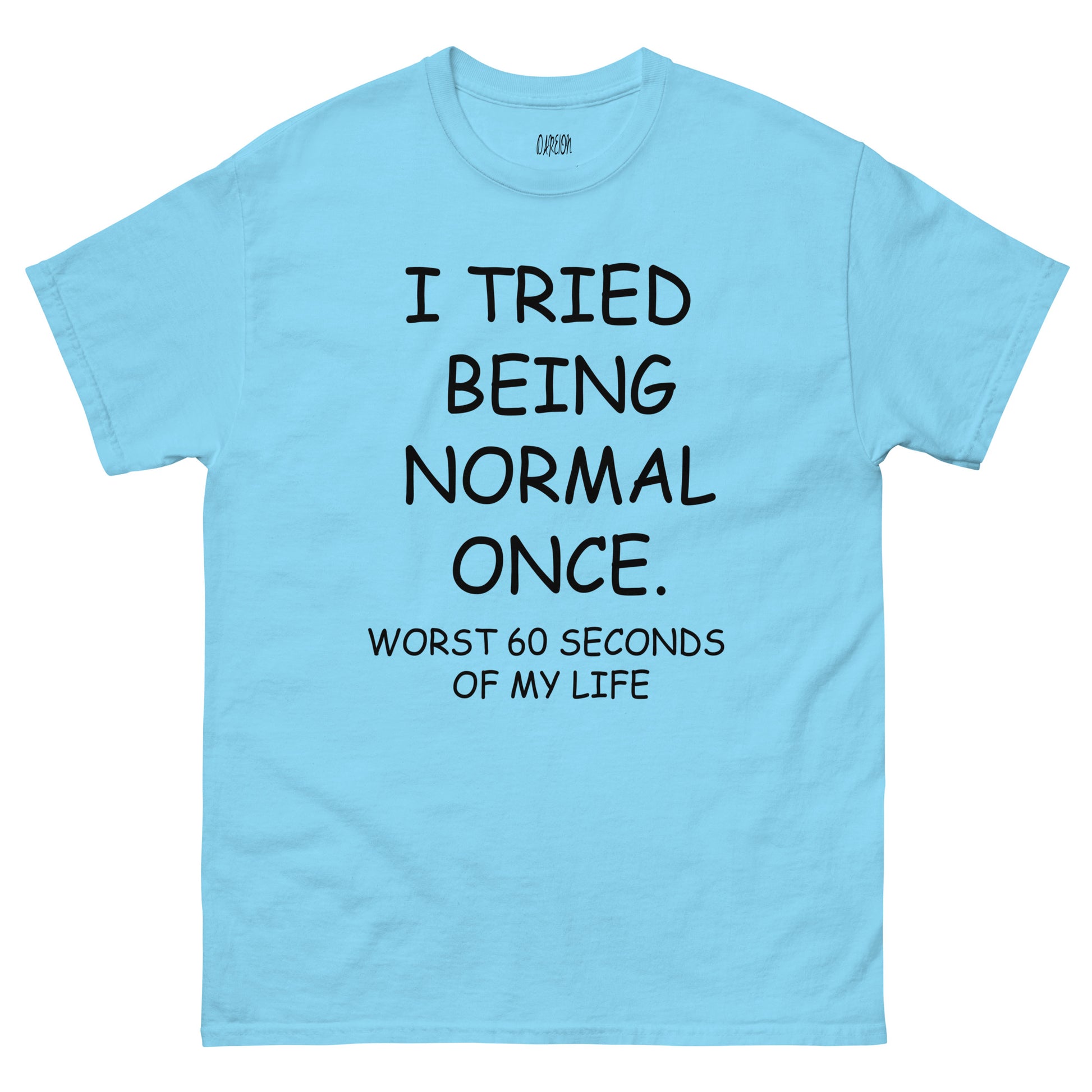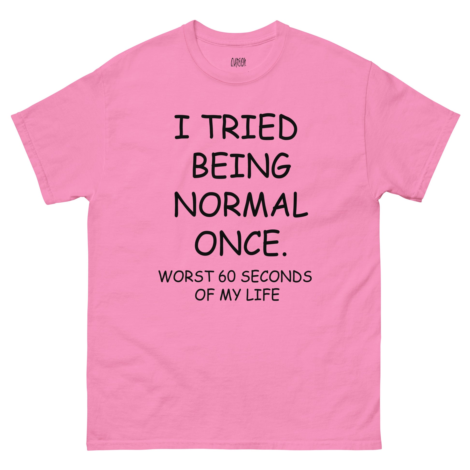 Embrace your individuality with our "I Tried Being Normal Once. Worst 60 Seconds of My Life" unisex t-shirt! Crafted from 100% cotton, this classic tee offers a structured look that sits nicely and maintains sharp lines around the edges. Perfect for anyone. It's an ideal choice for anyone who loves to stand out from the crowd.