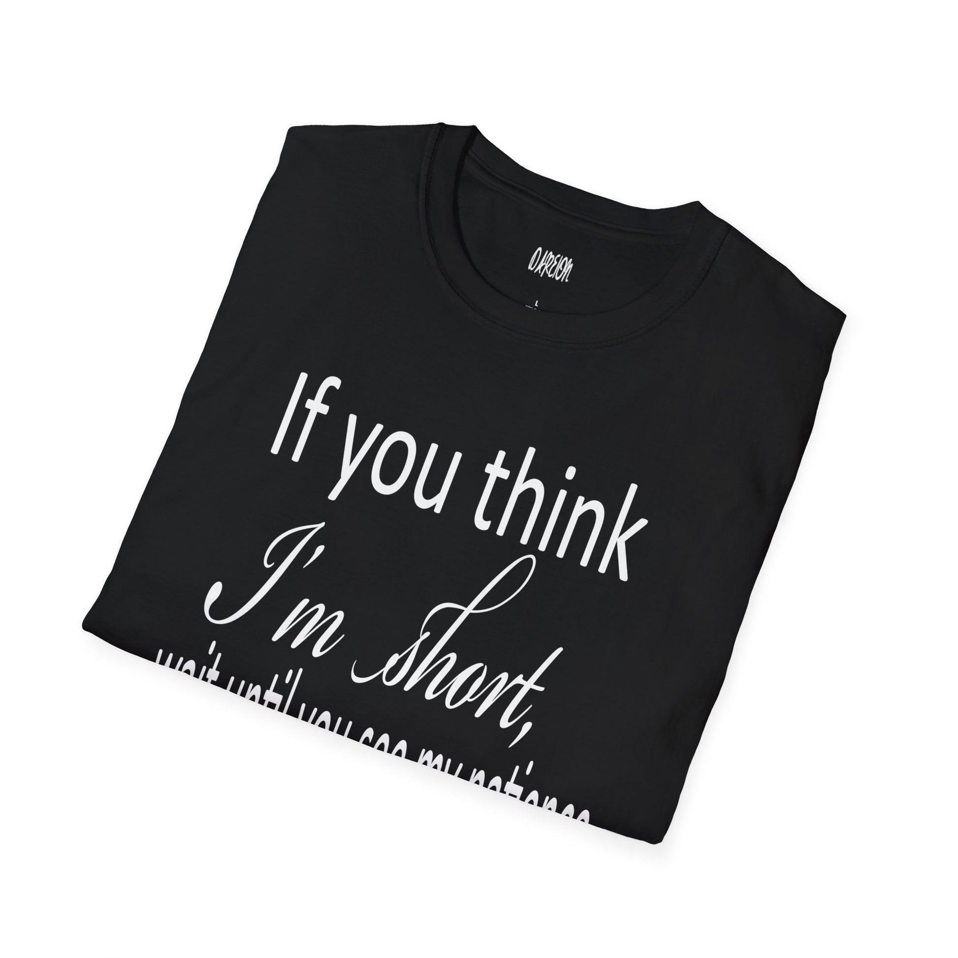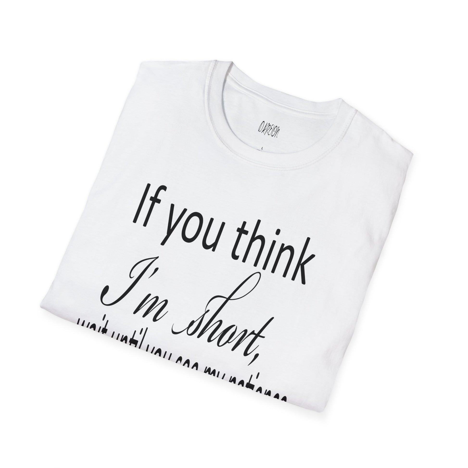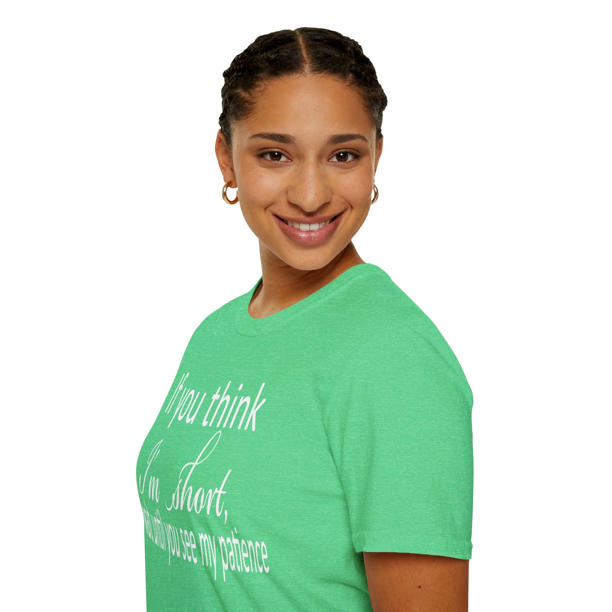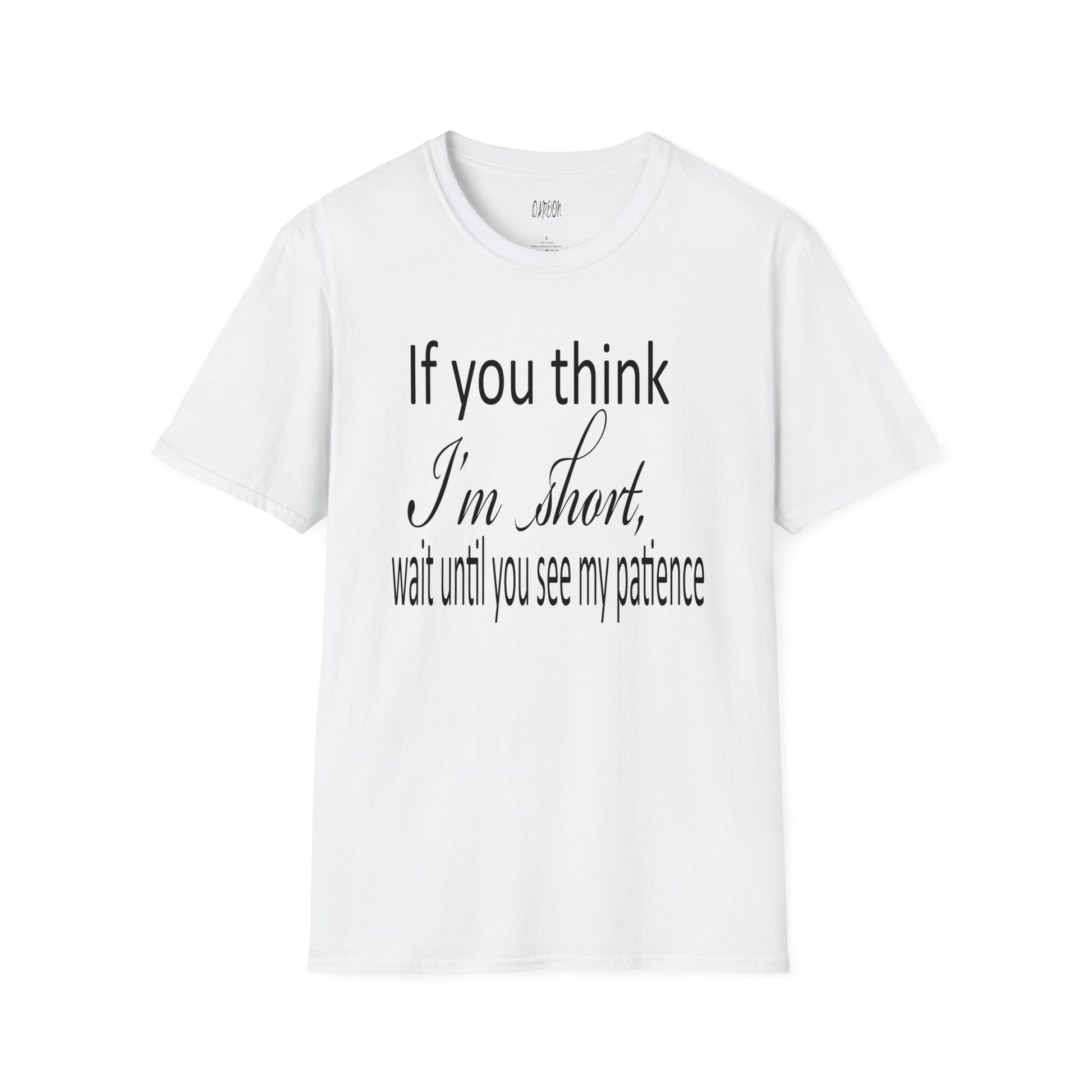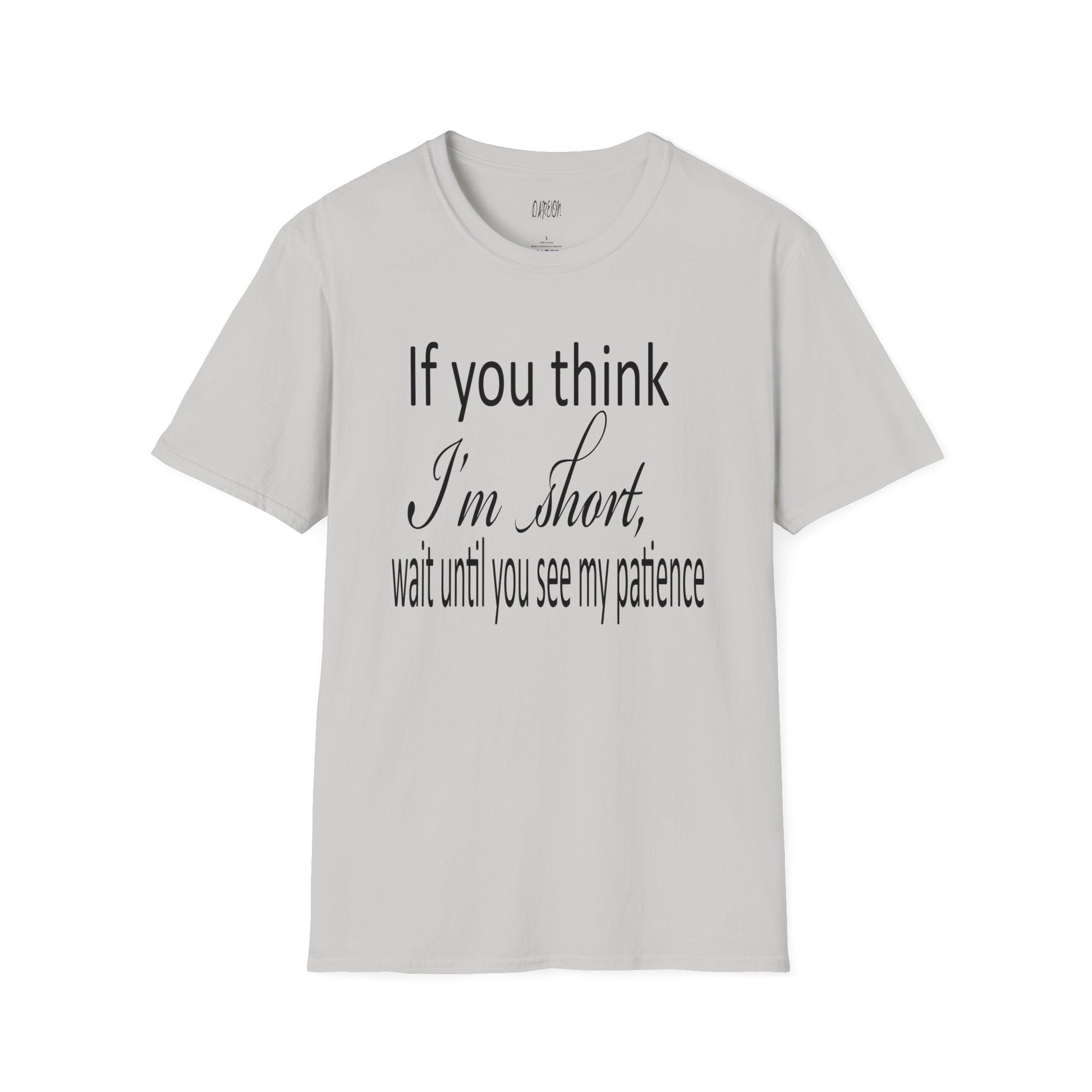 Get ready to add a splash of humor to your wardrobe with our unisex graphic tee, featuring the witty phrase, "If you think I'm short, wait until you see my patience." This soft-style t-shirt puts a new spin on casual comfort, making it the perfect blend of cozy and comical.