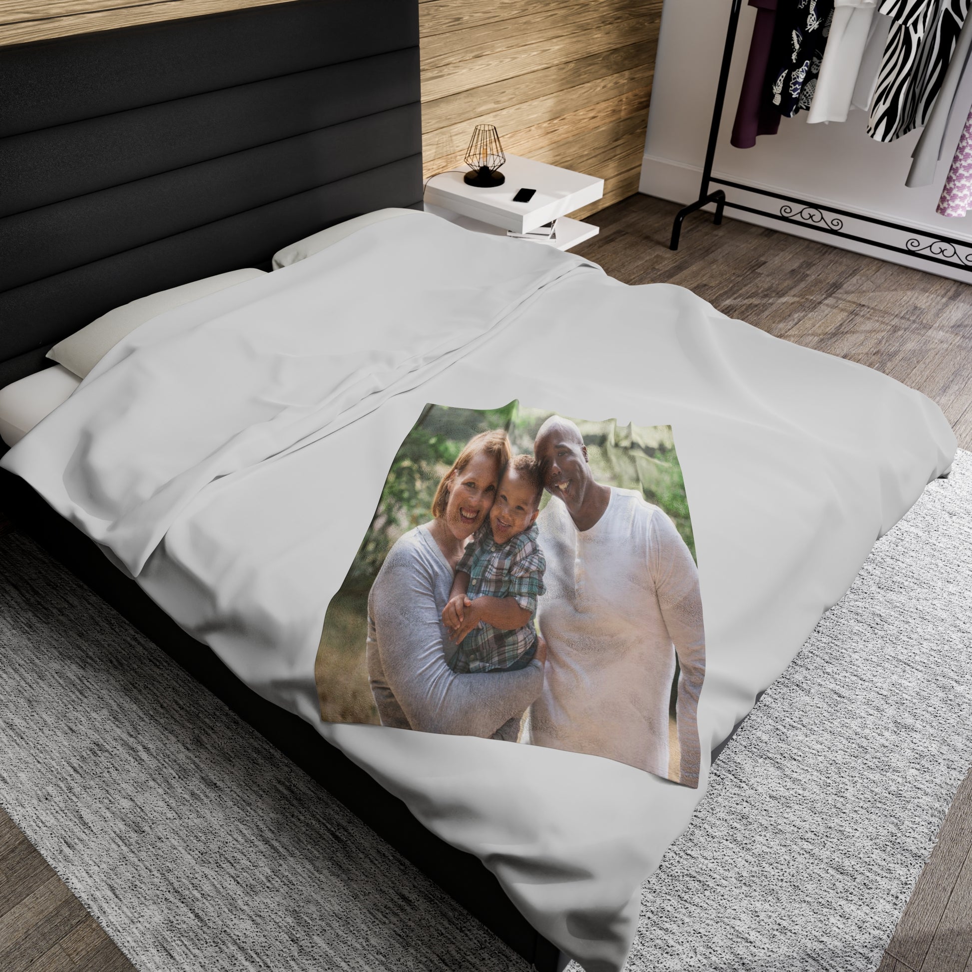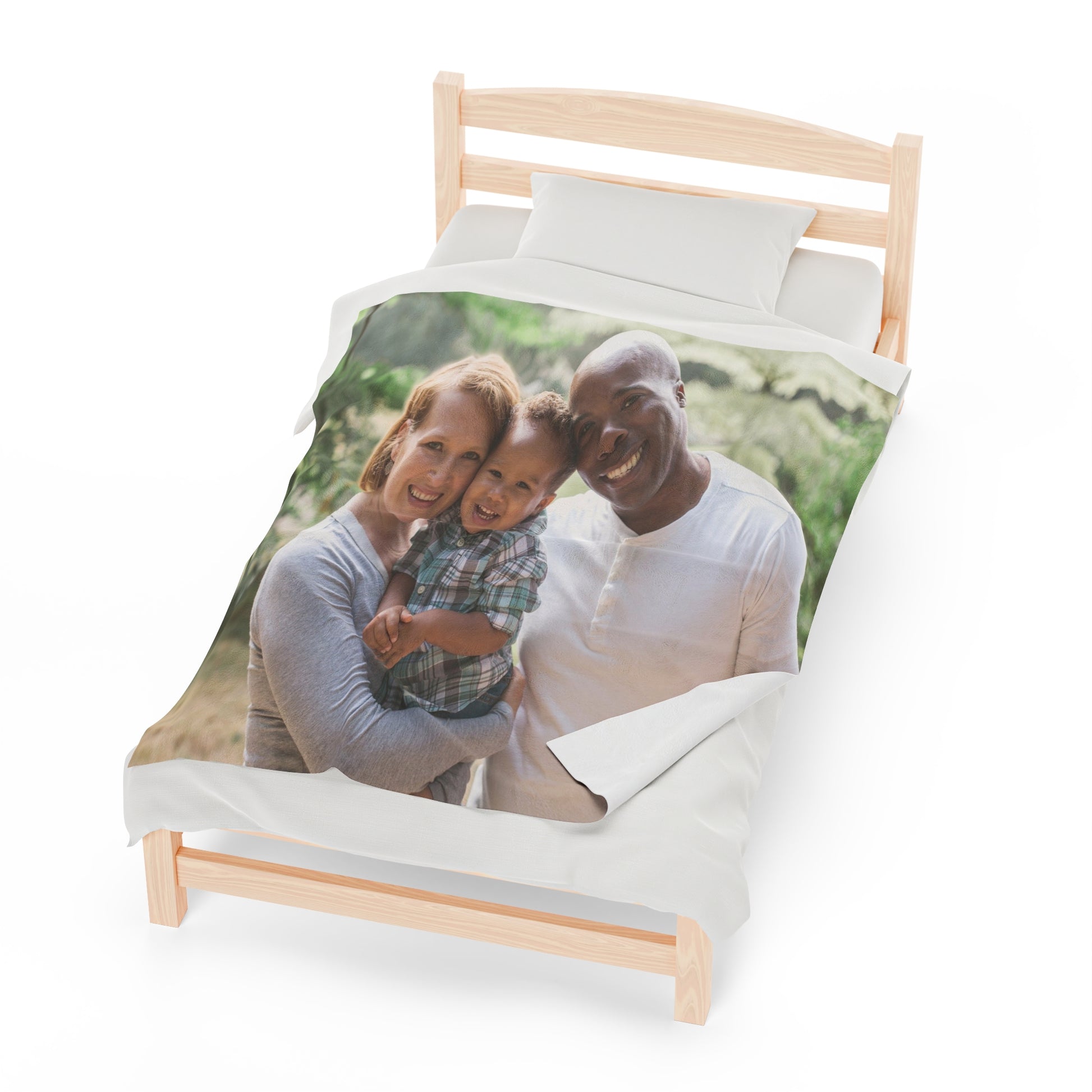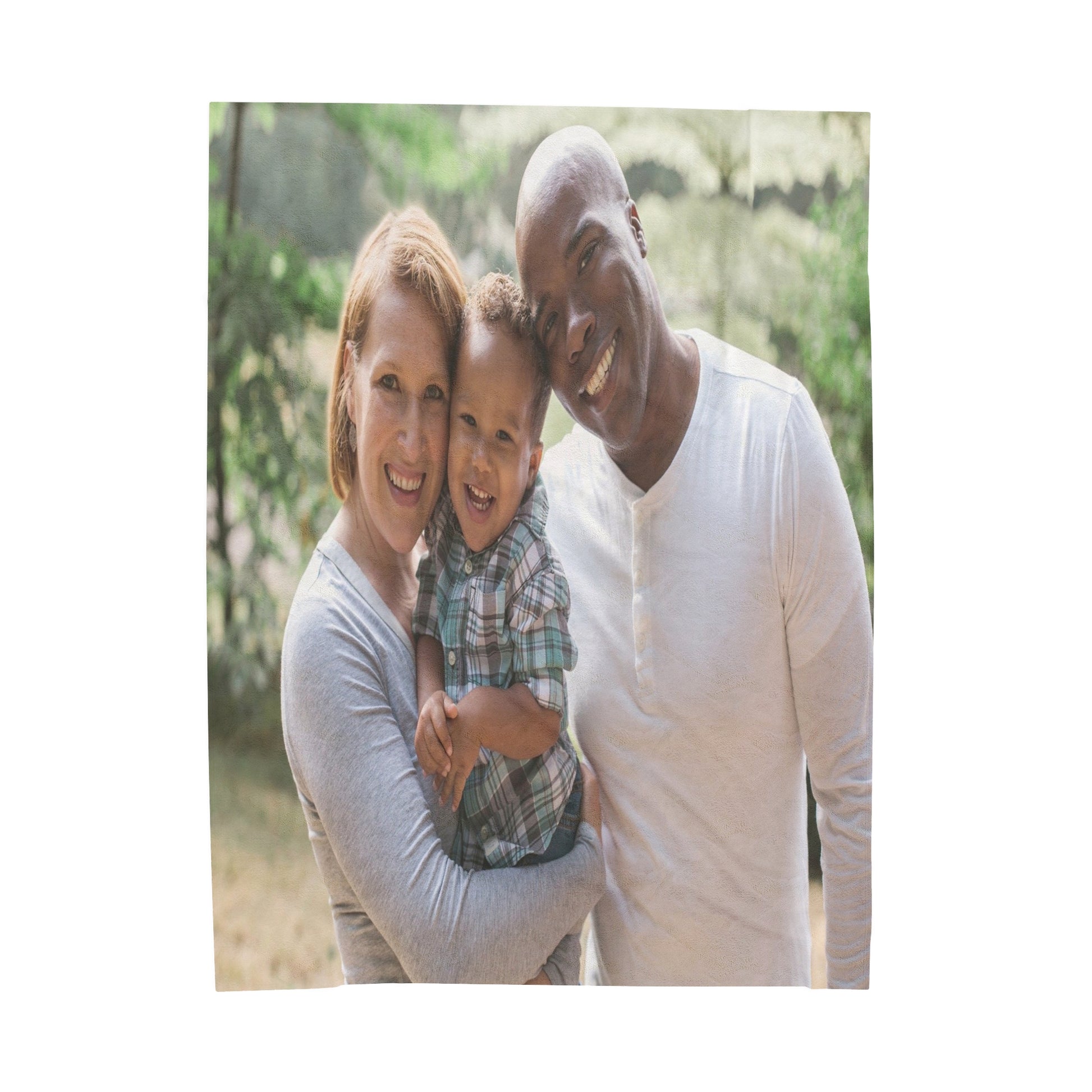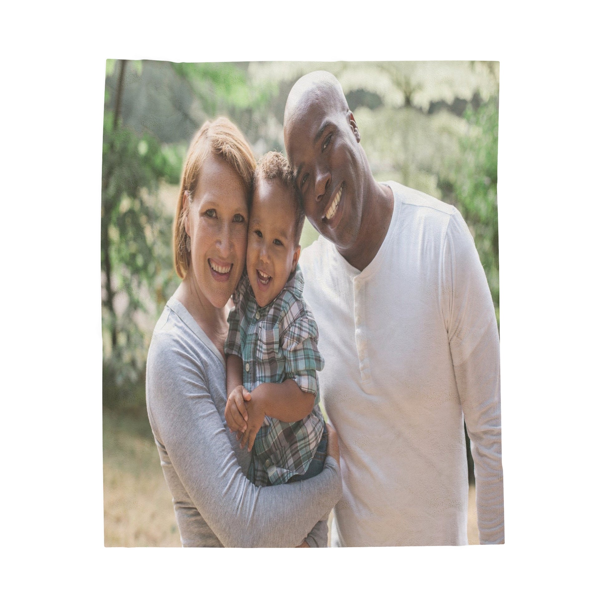 Transform your home into a haven of warmth and comfort with this luxuriously soft velveteen blanket. Designed to create a cozy atmosphere, it's gentle to the touch and ideal for any household. Personalize it with a cherished family photo, making it a heartfelt gift for Mom, Dad, sister, friend, or anyone dear to you. With a customizable one-sided print, you can add your unique touch to this blanket, ensuring it's a cherished keepsake for years to come. Available in three sizes—30x40", 50x60", and 60x80"—it's a versatile addition to any space, perfect for snuggling up with loved ones or adding a touch of personalized charm to your home decor.