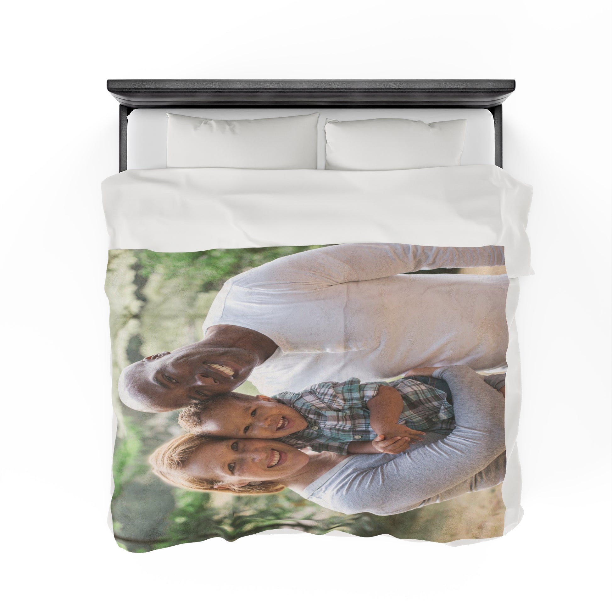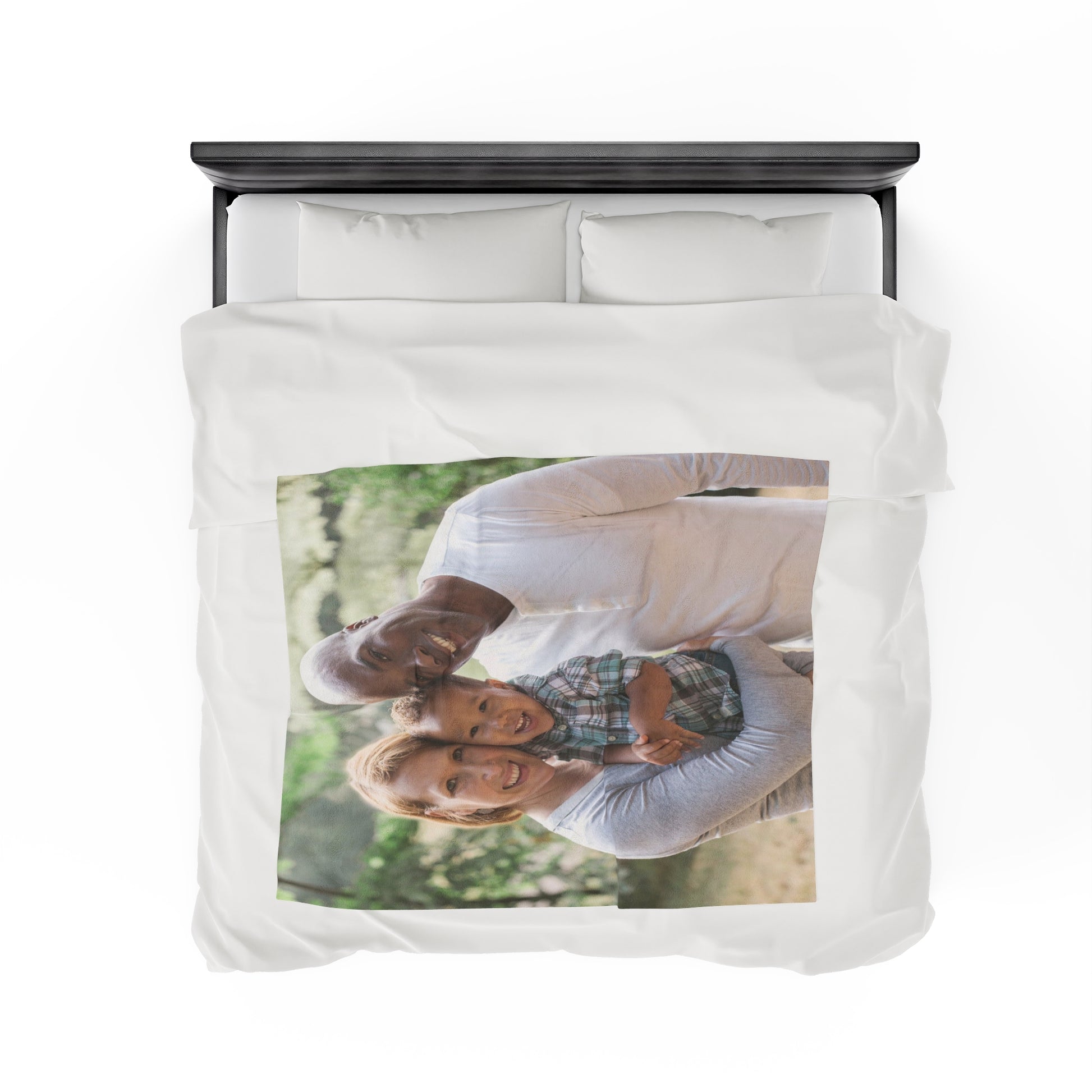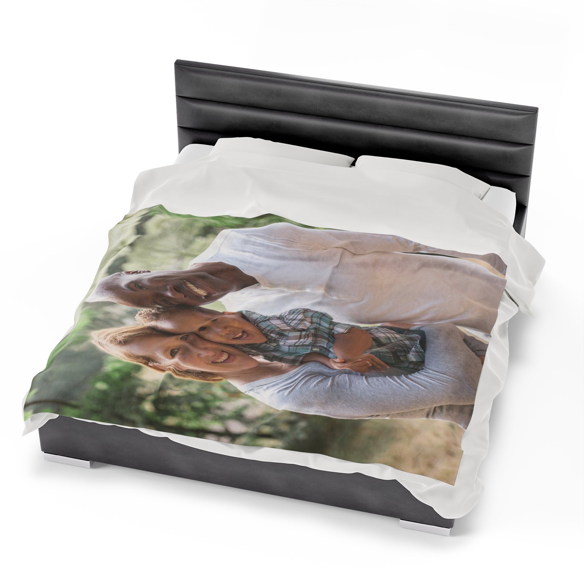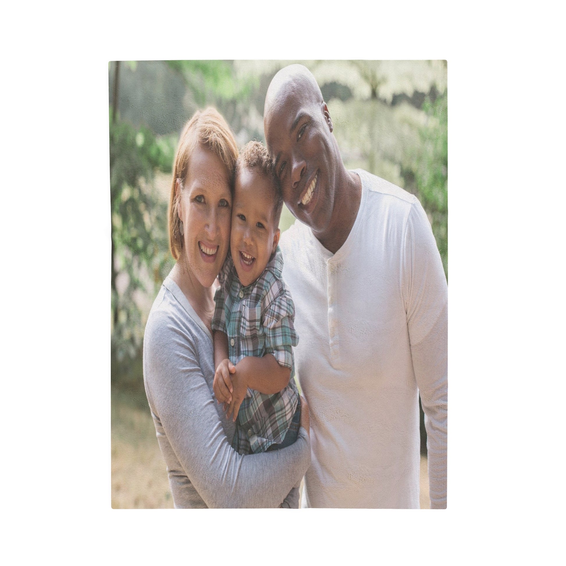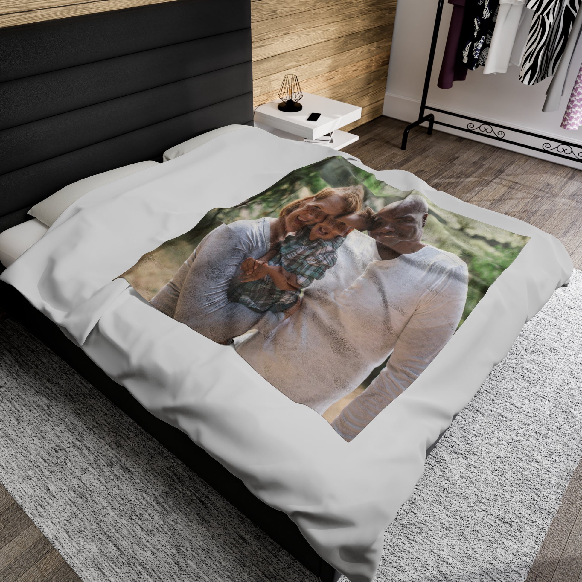 Transform your home into a haven of warmth and comfort with this luxuriously soft velveteen blanket. Designed to create a cozy atmosphere, it's gentle to the touch and ideal for any household. Personalize it with a cherished family photo, making it a heartfelt gift for Mom, Dad, sister, friend, or anyone dear to you. With a customizable one-sided print, you can add your unique touch to this blanket, ensuring it's a cherished keepsake for years to come. Available in three sizes—30x40", 50x60", and 60x80"—it's a versatile addition to any space, perfect for snuggling up with loved ones or adding a touch of personalized charm to your home decor.