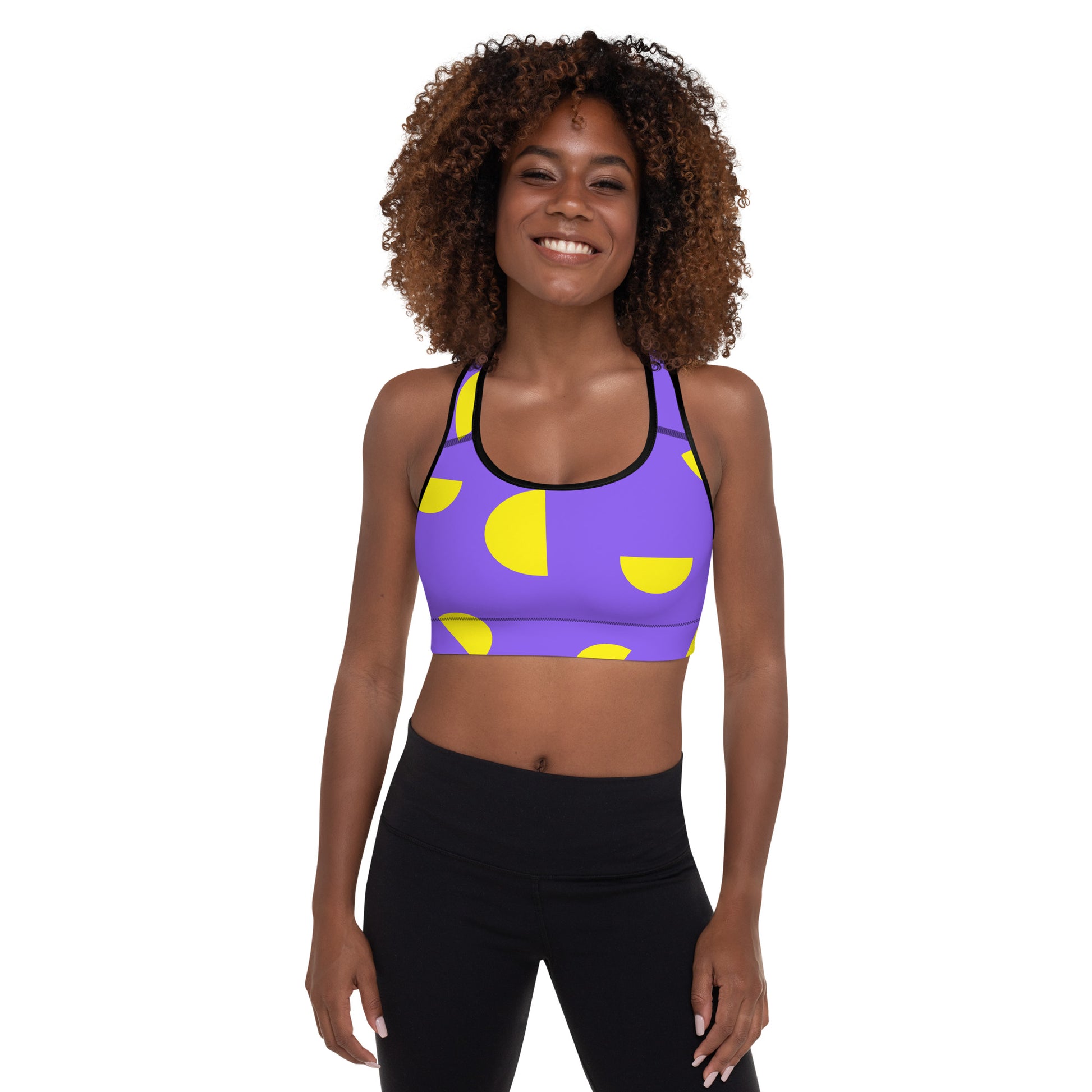Unleash Your Athletic Style with Our Purple Sports Bra Featuring Yellow Slices Design! Elevate your workout experience with this ultra-comfortable bra crafted from soft moisture-wicking fabric. Enhanced with additional materials in the shoulder straps, it offers unparalleled support, while the removable padding ensures a customizable fit for maximum comfort and confidence.