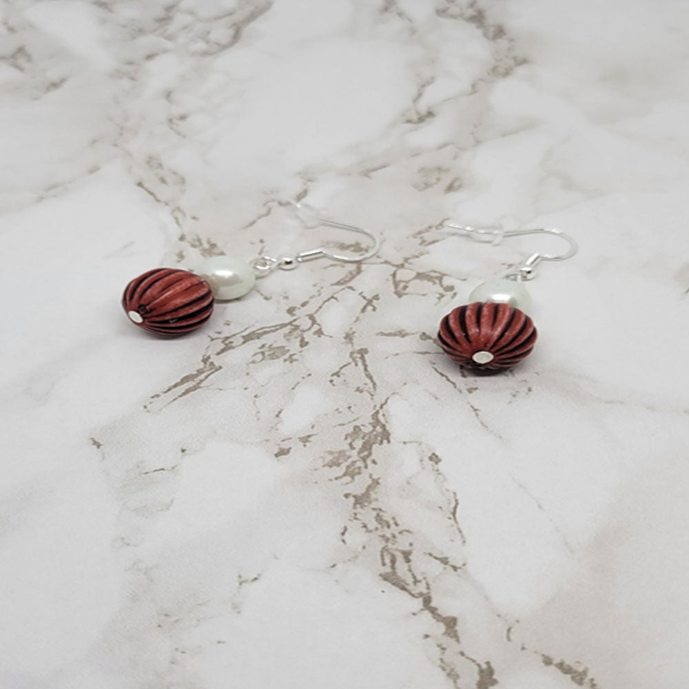 Round Pearl & Brown Beaded Dangle Earrings – Handmade Earth-Toned Drop Jewelry Gift for Her