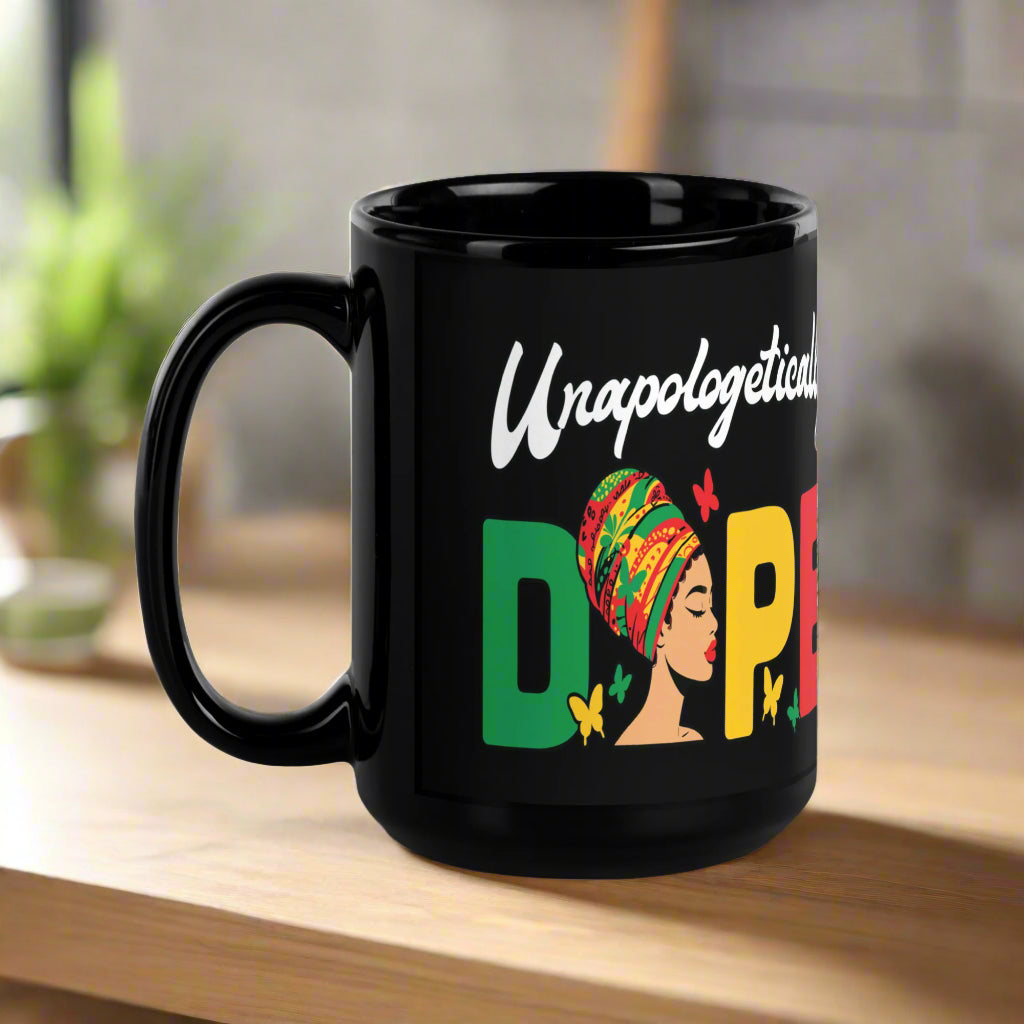 Introducing the "Unapologetically Dope" Black Glossy Mug—a statement piece for those who embrace their uniqueness with pride. Available in both 11oz and 15oz sizes, this sleek, high-quality ceramic mug features a bold, eye-catching design that celebrates confidence and individuality. The glossy black finish adds a touch of sophistication, making it the perfect addition to your morning routine or office desk. Whether you're sipping your favorite coffee, tea, or hot chocolate, this mug reminds you to be unapologetically yourself—every single day. Ideal for gifting or as a daily reminder to stay dope!